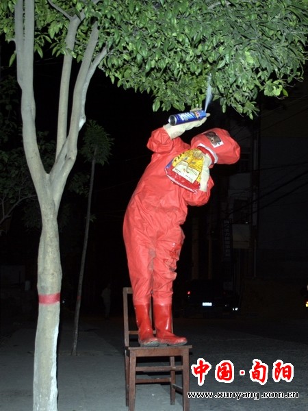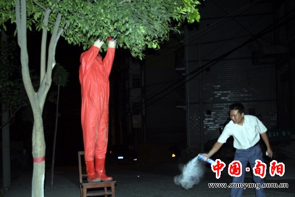 7月26日,旬阳县林业局接到电话称,县城行道树上发现一蜂窝危害行人人身安全。7月27日晚11点,该县林业局迅速行动,森防站两位工作人员穿着防护服来到胡蜂栖息地。在劝阻行人远离胡蜂栖息地后,工作人员搭起凳子,小心翼翼的靠近蜂窝,迅速用杀虫剂对熟睡的胡蜂进行第一轮消杀。说时迟那时快,工作人员趁着胡蜂还没有搞清状况迅速用袋子将胡蜂窝摘除,成功实施了人工捕杀。