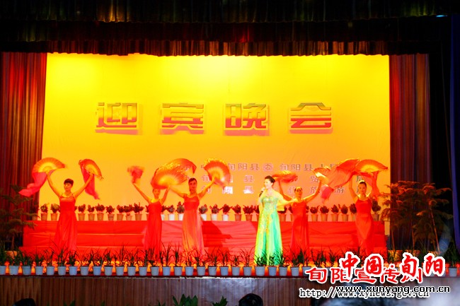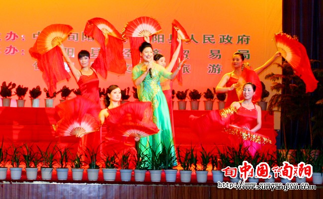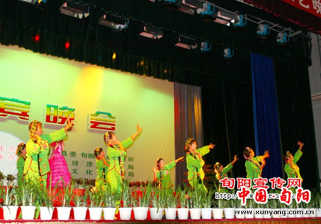 文艺晚会在大型歌伴舞《欢迎你到旬阳旅游观光来》的歌舞中缓缓地拉开了帷幕,晚会以旬阳民歌民舞为主,分别表演男声小合唱了《喊起号子闯险滩》、渔鼓说唱《生态立县兴旬阳》、旬阳民歌对唱《十对花》等节目。