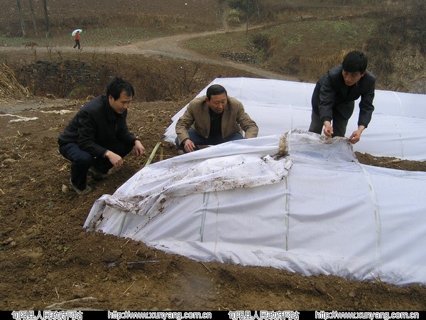 为了增加农民收入,陕西省旬阳县甘溪镇狠抓科技兴烟,今年该镇己落实8000亩烤烟种植面积.图为该镇干部会同烟草技术人员深入大田了解烟农育苗情况。