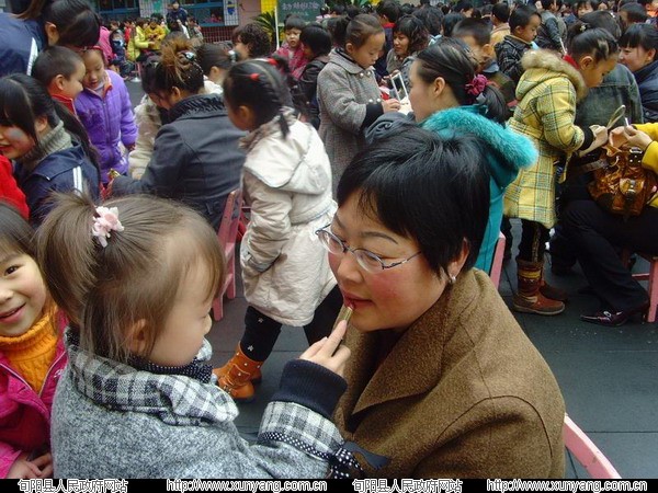 9:00整,院子里已经是人潮涌动,大班年级组正在展开“庆三八我为妈妈来打扮”主题活动,孩子们拿起妈妈的化妆品,一个个尽情发挥,在妈妈的脸上“精雕细琢”,画上了自己的“杰作”。经过40分钟紧张而激烈的战赛,可爱的妈妈们已经是“花枝妖艳”的出场了,她们和孩子们自行组合,向大家展示了自己的风采和美丽。