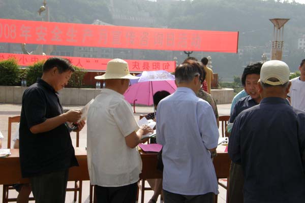 6月3日,由县安委办牵头,组织各成员单位在县城祝尔慷广场开展2008年安全生产月宣传咨询日活动。县安监局、水利局、城建局、经贸局、电力局、交警大队、质监局、乡企局、教育局、海事局、农机局等部门在活动中散发安全生产法律法规、安全知识资料、图片,播放“治理隐患、防范事故”安全教育光碟,现场解答群众提出的有关安全方面问题。
