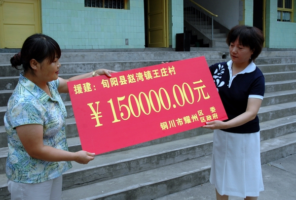 突如其来的地震灾害,对旬阳县造成了重大损失,全县28个乡镇全部受灾,民房、水利、公路、桥涵、校舍等遭受不同程度的损失,直接经济损失9120万元。灾情引起了省、市及兄弟县区的关注和支持,在省委组织部组织开展的“结对援建、传递爱心”活动中,旬阳县赵湾镇王庄村被确定为铜川市耀州区的帮扶单位。地震发生不久,耀州区就选派两名干部深入赵湾镇王庄村开展为期半年的驻村援建工作,他们及时与镇村干部交换意见,第一时间进村入户,了解村上基本情况和受灾情况,每天工作在村组,同农民同吃同住同劳动,耀州区领导也先后多次深入赵湾镇协助救灾。