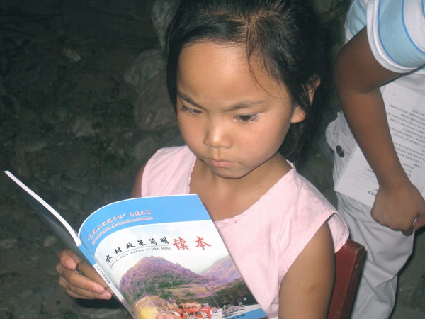 闻声而去,只见六七个小朋友簇拥在一农户门口,围着一个手捧着书本的大朋友认真地普着曲儿、唱着这首旬阳民歌《兰草花》。她们一个个专著的神情、稚嫩的声音,很是感人。