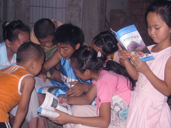 这位大朋友是白柳社区三组、正在陕西科技大学上大二的学生梁旬,他在前不久旬阳县在白柳镇举办的“先进文化进乡村”系列丛书发放现场领到了这本《优秀歌曲集锦》,便在晚上乘凉的时教这些小朋友学唱歌曲。