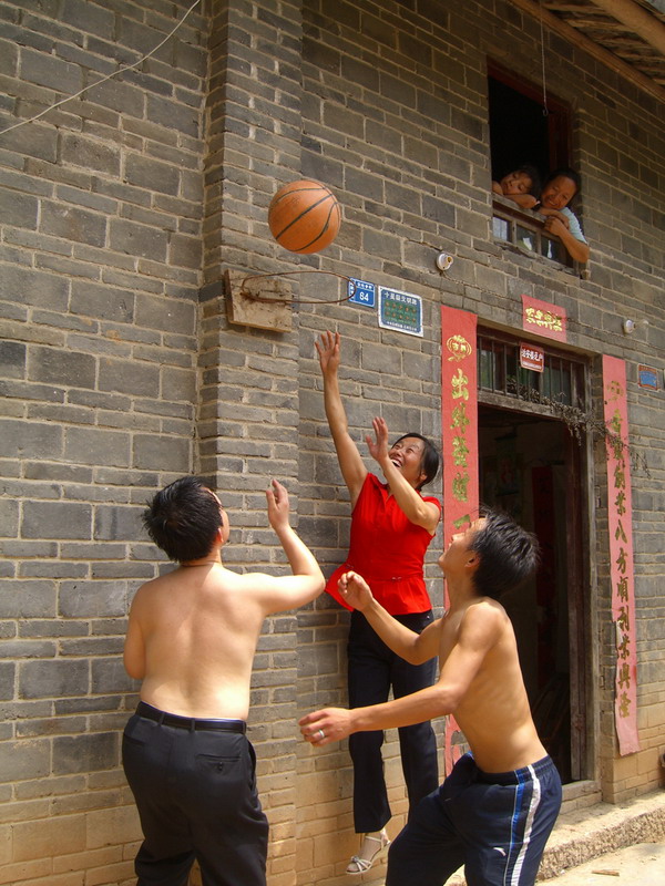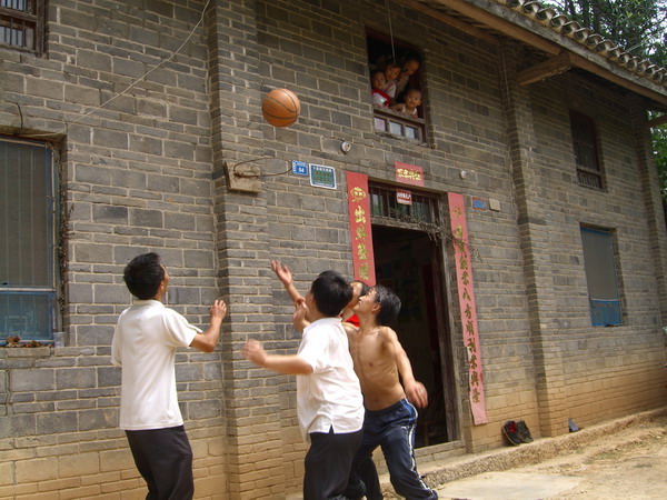 随着奥运会的一天天临近,陕南山区旬阳县迎奥运的氛围更加浓厚,图为段家河镇弥陀寺村二组农家小院的“迎奥运 篮球赛”。