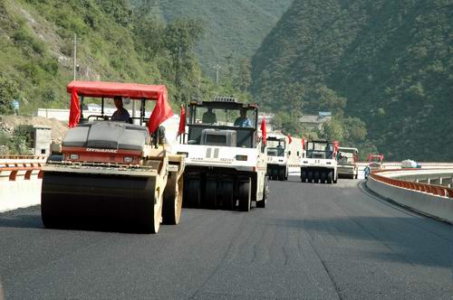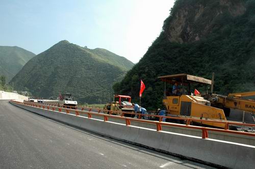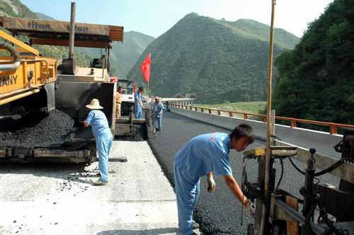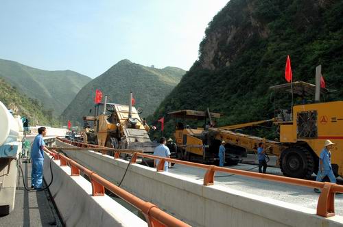 全长35.619公里、总投资1.998亿元的西康高速公路镇安至小河段,经过施工人员高温不间断施工,施工进度快速推进,将于本月底竣工。图为施工人员在高速公路小河立交附近铺设沥青。
