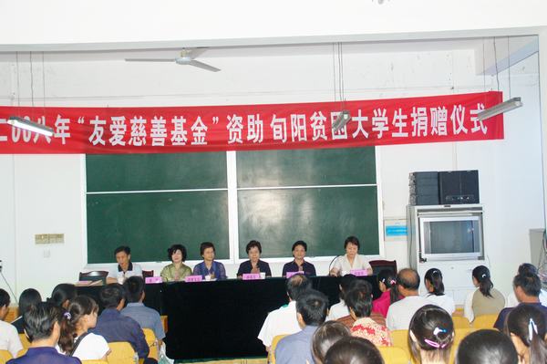 8月16日,“友爱慈善基金会”资助贫困大学生资金捐赠仪式在旬阳县旬阳中学举行。我县2008应届考入大学的何宏米、曹丹等15名特困大学生得到了香港建溢集团“友爱慈善基金会”的资助,每人每学期将获得6000元助学金。“友爱慈善基金会”的郑曾玉云女士、郑曾玉云女士、杨春芳女士、甘义娣女士亲自来旬参加捐赠仪式。“友爱慈善基金会”在我县连续3年资助贫困大学生名,捐赠资金达20余万元。在捐赠仪式上,县政府副县长李萍代表县委、县政府对郑曾玉云女士及其先生的善举表示衷心感谢,同时教导受助大学生要不忘救助之恩、好好做人、努力学习,将来报效祖国、回报社会,将这份爱心火炬传递下去。受助大学生及家长代表也在仪式上发言,深深感谢杨女士慷慨资助,表示一定会努力学习,做一个对社会有用的人才。
