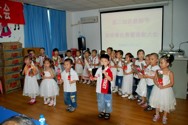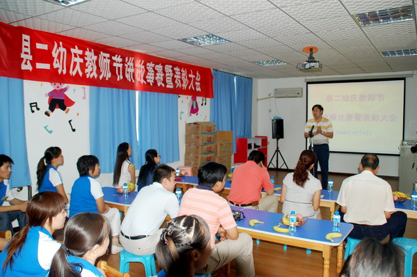 活动在南园长热情洋溢的节日致辞中拉开序幕,教师代表、家长代表的发言及祝福直切感人,特别是20余位手捧鲜花的幼儿献上的祝福,让老师们深切感受到桃李芬芳的自豪和骄傲,几位教师诙谐,生动的语言,惟妙惟肖的讲故事表演使大会气氛热闹、愉悦,展示了教师们扎实的语言基本功。教育局局长熊本奇在大会上做了重要讲话,对二幼近几年的快速发展及管理机制和水平给予很高的评价。对二幼今后的发展充满信心。并望二幼在辉煌中能更加开拓创新,奋勇创先,不断前进。同时提出了继续加强师德建设,业务能力提高,管理再上新台阶、迁建扩园这四点要求。