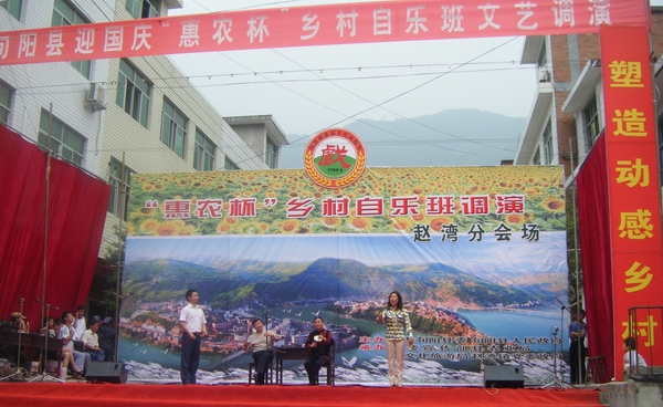 金秋送爽,丹桂飘香。在国庆即将来临之际,陕西省首届戏剧节,旬阳县“惠民杯”乡村自乐班北区文艺调演在赵湾镇隆重举行。9月23日,来自北区城关、甘溪、张坪、小河、公馆、仁河、桐木、麻坪、白柳、赵湾十个乡镇选送的一百余名自乐班演职人员齐聚赵湾,为观众献上了一道“农家味”十足的文化大餐。演出形式多样、编排新颖、主题鲜明,由甘溪镇选送的旬阳曲子弹唱《新型农村合作医疗政策就是好》、表演唱《自乐班里六只花》,赵湾镇选送的小戏《赞社会主义新农村》,桐木乡选送的小场子《不该捎话带信来》等节目不时赢得评委及观众的阵阵掌声。