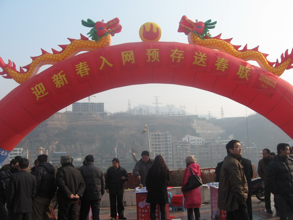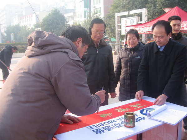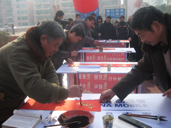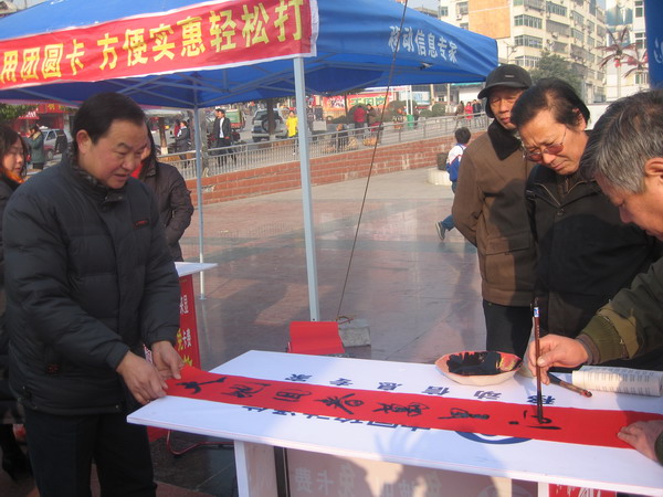 新年临近,大街上已呈现出一派热闹的场景,忙碌的人们穿梭在菜市场、商场、超市、服装店,尽情的选购中意的商品。年味儿是越来越浓,在这欢腾的时光,为弘扬光大传统的楹联创作艺术,进一步拓展移动通信业务,为“文化兴县”战略鼓与呼,旬阳县移动公司与县楹联学会举办2009年迎新年义务赠春联活动,红红的楹联铺满了广场的一角,煞是好看。