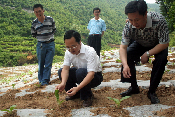 首先到甘溪镇的大岭台村,马赟去实地查看了甘溪镇的主导产业之一的烤烟栽培情况。这里是烤烟基地,用地膜栽植的技术使得一片烟地成了一副绝妙的风景。马书记到田间地头,实地查看烟叶生长情况,了解烟叶的病虫害防治措施。当得知,今年甘溪镇的烤烟种植面积达到8400亩,同比增长1300亩时,马赟很高兴。他说:“当前烤烟移栽形势较好,希望在后面管理、烘烤、收购时把好关,确保农民增收。”