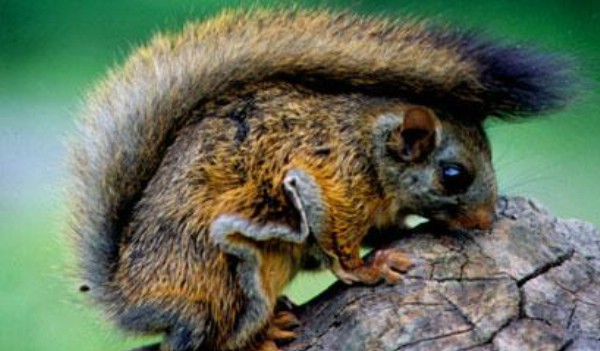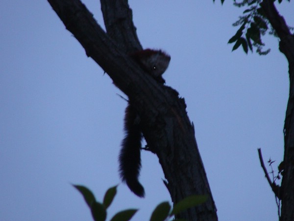 接到举报后,甘溪镇政府立即同县林业局取得联系。随即,笔者随同县林业局梁延奇副局长赶到现场。现场距大岭水电站约200米,周围有数十户群众居住。奇怪动物盘踞在七、八米高的红椿树上,因天色较暗,看不清楚,只见其尾硕大,状如松鼠。