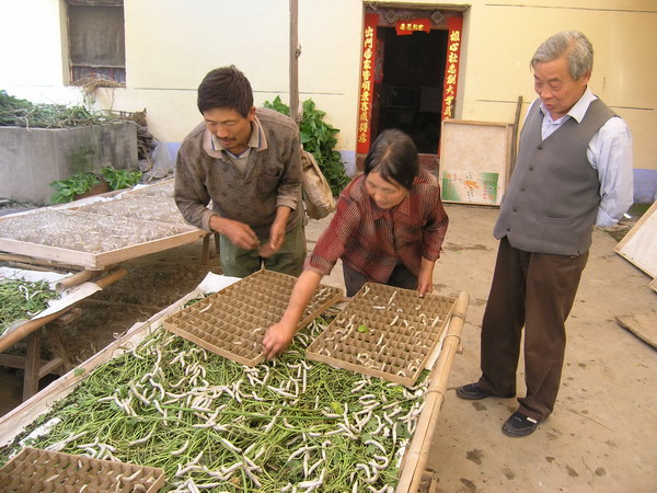 旬阳县麻坪镇依靠科技兴桑养蚕的战略,提高栽桑养蚕的经济效益。全镇建立优质桑苗繁育示范园120亩,标准化蚕室300间,小蚕共育室375间,培育科技示范户350户,省力化蚕具普及率达到90%以上。全镇年养蚕5200张,较上年增加1000.00元,实现产值300余万元,户均张产达到40公斤以上,人均增收300元,是旬阳的蚕桑第一镇。 图为李家村民正在养蚕。