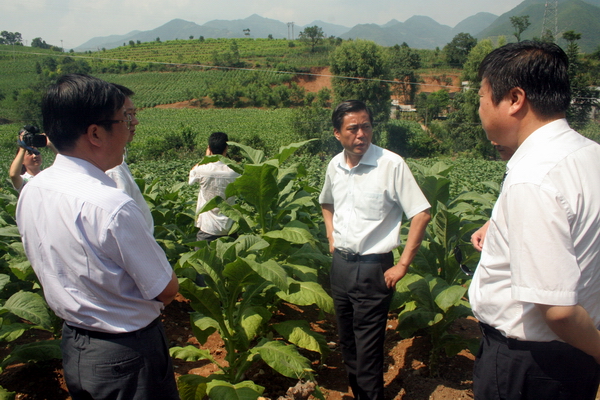 在甘溪,考察团对长势喜人的烟叶产生了浓厚的兴趣,冒着高温走到田间,了解烟叶生长及烘烤情况,了解农民增收情况。考察团汗流浃背,但是毫不影响他们的兴趣。