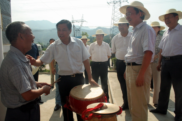 在白柳社区,该社区农民自乐班敲起了欢快的锣鼓,扭起了欢庆的秧歌,欢迎考察团的到来。刘新余书记和马赟书记作了交谈,马赟书记向考察团一行简单介绍新型农民教育工作。百柳镇、白柳社区负责人就农民教育工作分别向考察团作了汇报。 结束后,已是40度高温,考查团得知白柳镇组织农民自乐班,曾经编排有地方特色、群众喜闻乐见的文艺节目,能使农民学到更多的知识,能丰富群众文化生活时,非得坚持看一看。于是,在百柳社区广场,音乐飘荡,掌声响起。自乐班队员表演了《太极城姑娘》和《一江春水送北京》。两位书记兴致勃勃的观看,并亲切和老艺人握手。