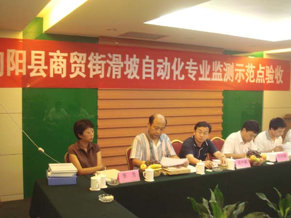 8月8日至9日,由中国地质环境监测院周平根博士任组长的5人专家组,对旬阳商贸街滑坡自动化专业监测示范点(站)进行了验收,专家组通过实地查看野外仪器设备安装、审读建设报告及相关资料、操作监测系统、查阅从4月份以来试运行期间的数据分析、听取建设单位的工作汇报后,经讨论评议认为:该监测示范点(站)建设完成了设计书任务要求,达到了预期目的,在国内处于领先水平。