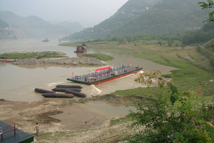 据悉,该跨江浮桥驳船由陕西省交通运输厅投资,内蒙古包头市平安航运公司设计和承建,浮桥全长300延米,型宽8.6米,行车宽度4.6米,共8节(艘),设计投资近千万,浮桥建成后,将打破严重制约十天线安康东旬阳段的交通运输瓶颈,有效推进十天高速线建设进程,同时也成为旬阳南区12万百姓期盼已久的便捷通道。