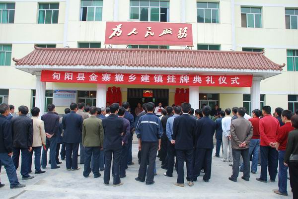9月30日上午,旬阳金寨镇群众欢聚在镇政府,燃放鞭炮,敲响锣鼓,共同庆祝金寨撤乡设镇。县政府副县长陈刚、县工会主席袁文勇出席揭牌仪式。