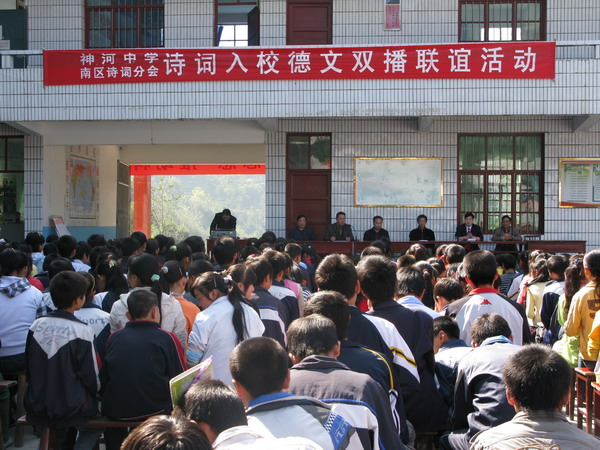 近年来,神河中学的“校园诗词”在校园文化建设领域硕果累累,涌现出诗歌作者四百余人,加入各级诗词学会二十余人,并且以本校师生为主体成立了“旬阳诗词学会南区分会”,编辑翻印《校园诗词》二十一期,编辑出版《神河中学校园诗集》三集,收录诗、词、文、联2000首(篇),共计一百万字,其中不乏感情真实、文字清新、意境高远的好诗好词。《校园诗词》充分发挥了“诗教”育人“潜移默化”的作用,成为神河中学一张名片,声名远扬。学校被旬阳县诗词学会命名为“诗词进校园”试点学校,事迹和经验在国家级诗刊《中华诗词》上登载。本次在金寨初中举行的讲座,是神河中学在南区初中开展“诗词进校,德文双播联谊活动”的第一站。