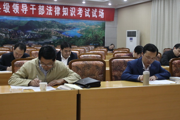 10月28日上午,我县组织40名处级领导干部参加学法用法考试,考试内容以全国“五五”普法统一教材《干部法律知识读本》及宪法、刑法、行政许可法、公务员法等相关法律法规为重点内容。参加考试的领导干部都在规定时间内及时完成答题,我县参考率达到100%。
