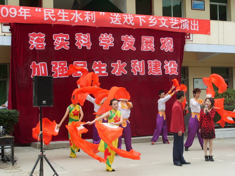 11月3日,由旬阳县委宣传部、水利局、文化旅游局和公馆乡联合组织的“学习实践科学发展观,‘民生水利’送戏下乡”文艺演出在公馆乡中心学校操场隆重上演,对口快板《水利赞歌》、小戏《水窖情》、《甜水泉》等10多个喜闻乐见的节目不时博得现场观众的热烈掌声。公馆乡党委和政府有关领导及当地干部群众共500多人观看了演出。