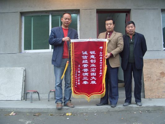10月10日上午,吕河镇中心学校将印有“锐意创业宏图大展,诚信经营誉满三秦”字样的锦旗送到了吕河宏宇石料厂,以感谢其无私援助。
