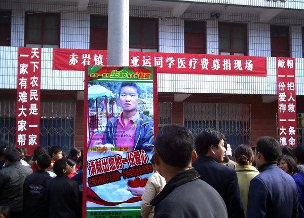 12月1日,赤岩财政所门前人头攒动,全体机关干部、中小学生、街道居民近1000人汇聚一起,在《祝你平安》、《只要人人能献出一点爱》的乐曲声中,纷纷慷慨解囊,4万余元爱心捐助换肾高中生刘亚运同学。