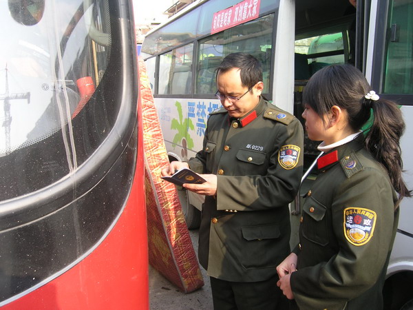 为创建“平安畅通旬阳”营造良好道路交通环境,旬阳县运管所自12月18日开始至3月18日在全县范围开展为期3个月的冬季道路交通安全专项整治。通过整治,使道路交通违法行为得到有效遏制,确保辖区内道路交通不发生较大以上事故,为2010年安全生产工作奠定良好基础。图为运管所合同县运输公司对客运班线车辆进行检查。