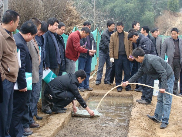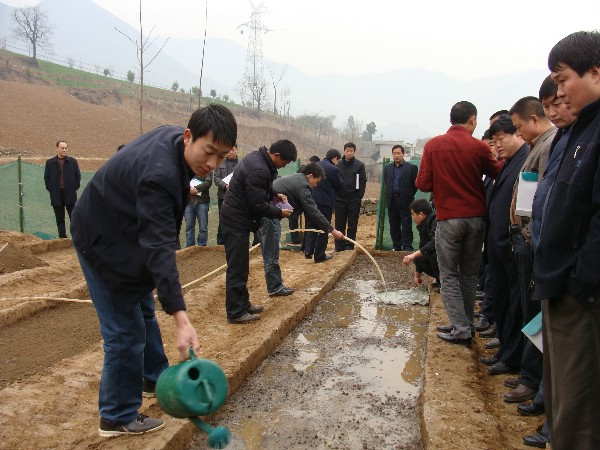 现场会采用边讲解、边演示的方法进行。在标准化育苗场地,技术人员先在规范的苗床里均匀地铺上一层营养土,然后撒上烟种,再均匀地浇足水,待水润湿整个苗床后,再覆上一层营养土,最后再覆盖上塑料纸,整个育苗工作才算结束。旁边,县烟草局的技术人员结合演示进行现场培训,并对育苗操作、消毒剂使用等关键环节进行了规范。