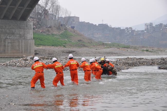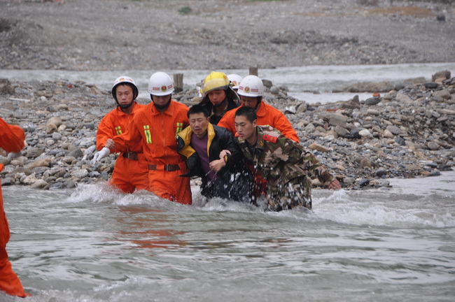 在进行现场勘察后,救援战士组成救援小组,过河救援。两名攻坚组成员,手握着手,肩并着肩,并排在湍流的河水中艰难前行,一次次被冲倒,又一次次爬起来继续,不久,救援小组成功到达孤岛。看到消防官兵后,被困人员的情绪很快稳定了下来。