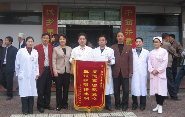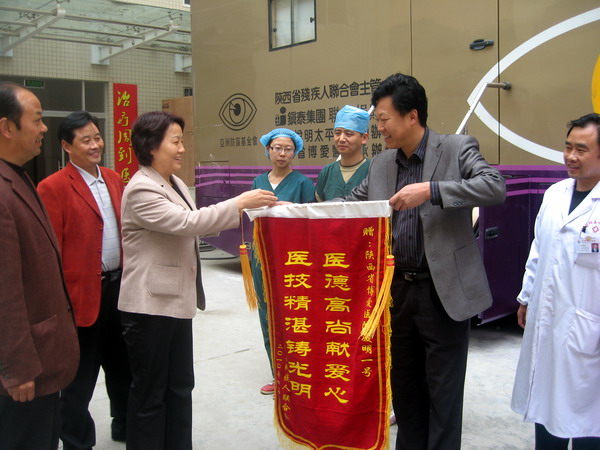 4月19日上午10时,县委常委、统战部长田丽萍、县残联理事会负责人向陕西省博爱医院复明一号手术车的医务人员赠送一面书写为“医德高尚献爱心 医技精湛铸光明”的锦旗,感谢他们为旬阳的白内障患者解除病痛,使他们重见光明。