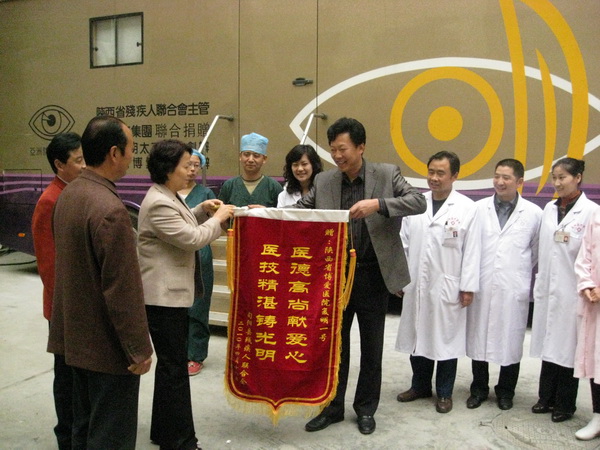 4月19日上午,旬阳县委常委统战部长田丽萍,县残联副理事长李明堂,纪检组长谢同银分别为省博爱医院复明一号手术队和县中医院赠送锦旗一面内容为“医德高尚献爱心,医技精湛得光明”,代表县委,县政府,县残联以表感谢。