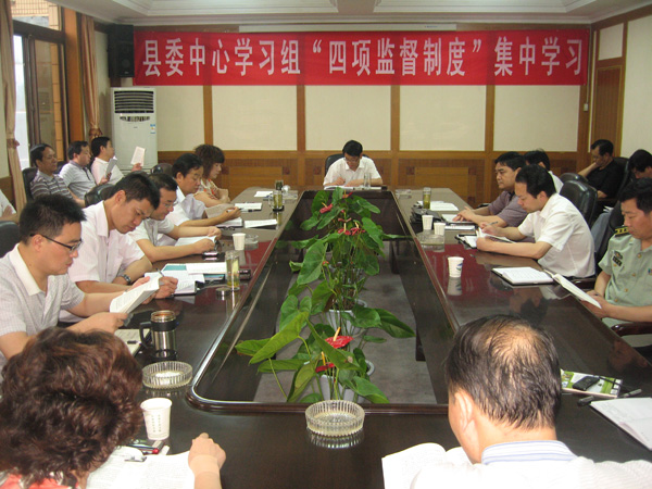 7月5日,旬阳县委中心学习组进行了今年第三次集体学习,主要学习了《党政领导干部选拔任用工作责任追究办法(试行)》、《党政领导干部选拔任用工作有关事项报告办法(试行)》、《地方党委常委会向全委会报告干部选拔任用工作并接受民主评议办法(试行)》、《市县党委书记履行干部选拔任用工作职责离任检查办法(试行)》四项监督制度。县委书记邹俊杰主持了学习活动,并做重要讲话。