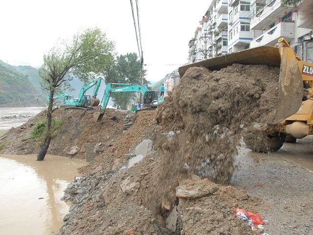 316国道旬阳县城上渡口出现险情,防汛指挥部立即派出30多名消防、应急队员会同抢险队一起抢修道路,力保国道通行及居民住房安全。
