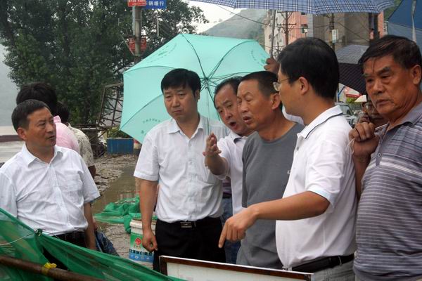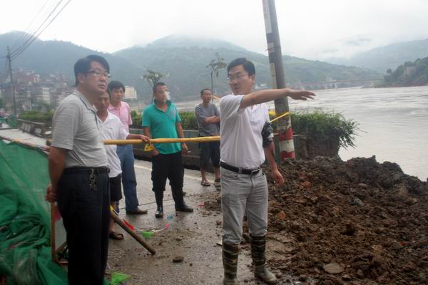 县委书记邹俊杰、代县长张益民坐镇防汛指挥部,安排转移、撤离等工作。早11:00.接到我县滨江路316国道遭遇险情,出现大面积断裂,现场动用1万立方砂石料紧急回填,确保316国道畅通,确保临近居民安全。邹俊杰、张益民先后到上渡口滨江路处查看316国道险情,并随时交换意见。