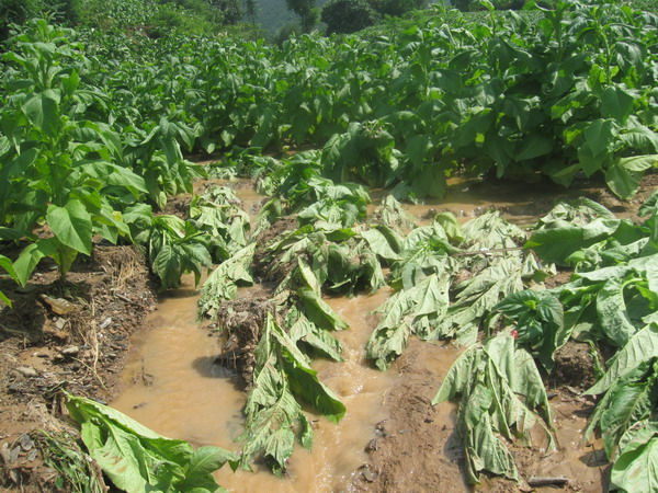 烟田遭受暴风雨袭击后,烟田烟株大面积倒伏烟叶被折断。同时,持续的大雨造成部分区域山体滑坡和泥石流,导致部分田块的烟株被淤泥淹埋造成绝收,部分烟田基础设施也不同程度遭受毁损。全县180个村,621个组,4341户不同程度遭受灾害,烟叶受灾总面积42042亩,其中倒伏面积29885亩,绝收面积8617亩。 连续的持续大雨,造成部分区域山体滑坡、泥石流发生,致使部分烟叶基础设施建设项目不同程度遭受损毁。据初步核查统计,损毁密集烤房11座,损毁普通烤房10座,损毁水池5口,损毁烟田机耕路23条59.75公里,损毁育苗大棚16个。总计经济损失近3000多万元。据了解,“7.24”的烟草灾情情况正在统计当中。