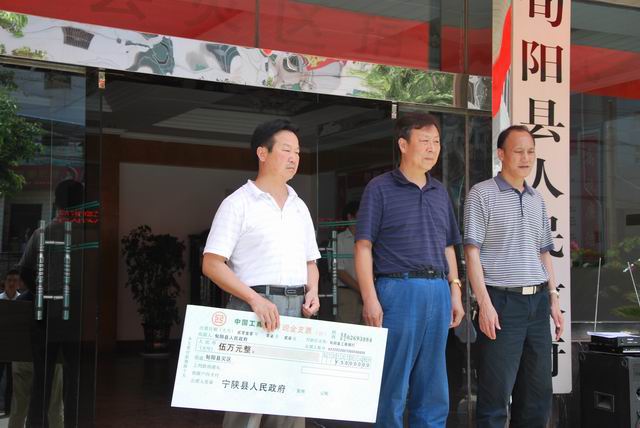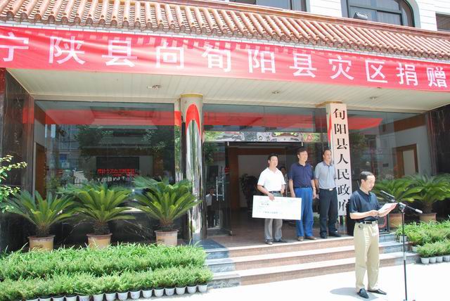 7月27日中午,旬阳县政府举行了宁陕县向旬阳县捐赠仪式,县人大常委会副主任熊生明出席并主持仪式,宁陕县人大常委会主任汪时政代表宁陕县委、县人大、县政府、县政协和7.4万宁陕人民向旬阳灾区人民表示慰问,并捐款5万元支援旬阳防汛救灾和灾后重建工作。旬阳县政府副县长陈刚代表旬阳县政府接受宁陕捐款并致感谢辞。