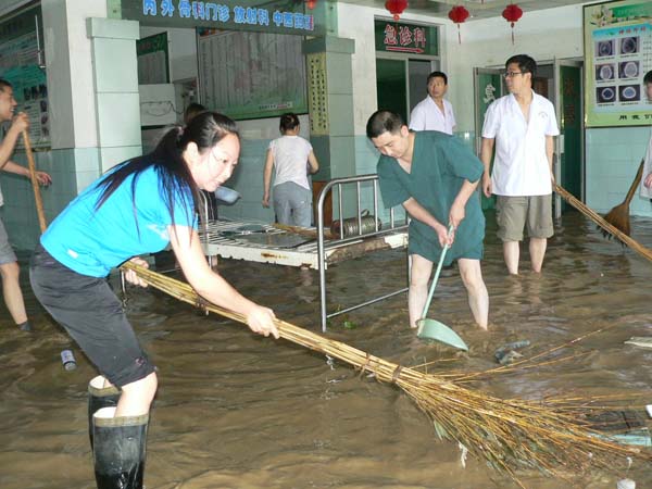 县中医院院长刘华明说:“氧气和药品当时是我们优先抢救的物品,这都是病人治疗的希望”。集中供氧中心让水淹了,就采取分散式供氧,药架坏了就用档案柜代替,医院一直保持着两千多种药品的临床供应。54岁的药剂科副主任樊荣武,长期患有高血压、心脏病和严重的椎间盘脱出症,大量的剧烈劳动可能使病情随时发作,但他始终坚持在医院,组织科室职工们搬运、整理药品,他知道,此时保住了药品,就是保住了院内一百余名病人的希望,开始为了防止水淹,将药品搬到六楼,最后又为了方便病人,又将药品搬到二楼,对病人的这份感情使他不知疲倦,忘记了自己身上的病痛。