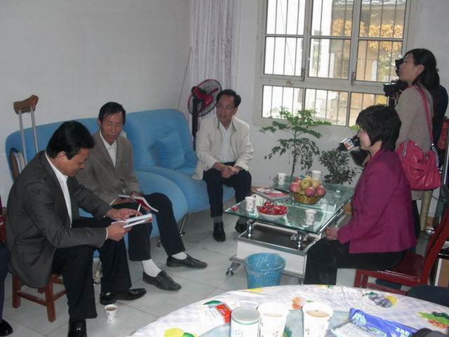 10月12日,省残联理事长洪康喜在市政府副秘书长冉立新、市残联理事长陆隆敏、县政府副县长李萍的陪同下冒雨来到桐木镇白石河村,看望慰问“党的义务宣传员”、省“自强模范”黄世和。