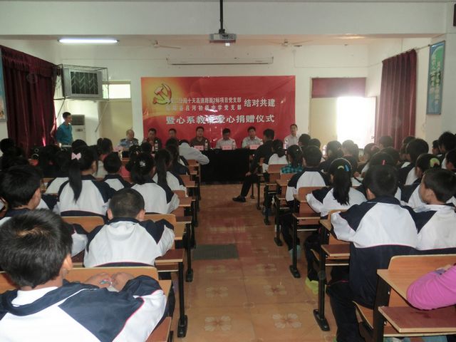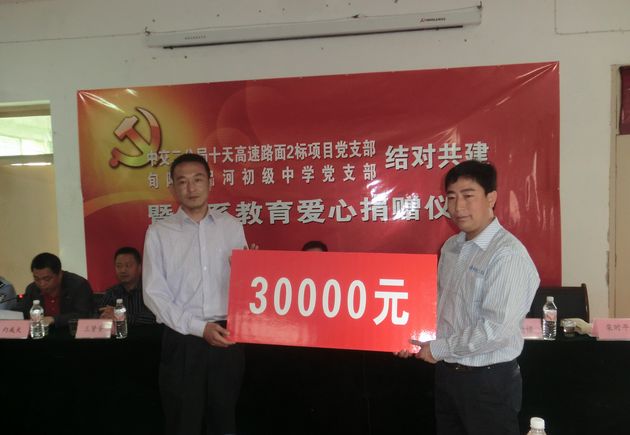 5月4日上午,中交二公局十天高速路面2标在“党支部结对共建暨捐赠仪式”上向吕河中学捐赠了3万元的助学金。这是吕河镇党委政府开展“争先创优、支部结对”活动见实效的温馨一幕。