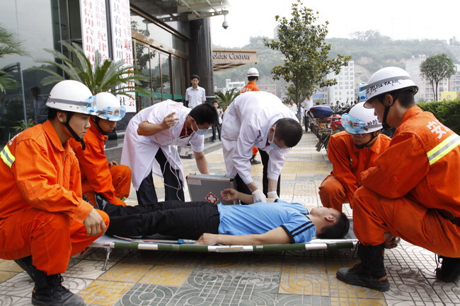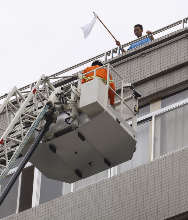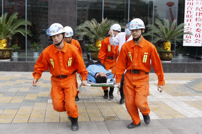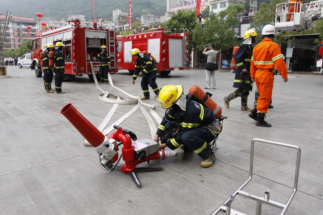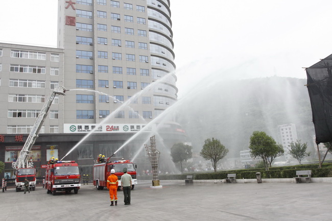 演练假设广场一幢高层建筑发生“火灾”,火势迅速蔓延,楼顶有人员被困,险情发生后,县安监、公安、消防、卫生等多个单位迅速出动,火速赶到现场,一台云梯车、两台消防车、一台医疗救护车集结到位,随后,参战单位迅速展开救援,由消防部门为主要战斗力量,其中一个小组在32米云梯车的辅助下搜救楼顶被困人员,另一个小组用两支高压水枪从建筑左右两侧对着火点实施扑救,公安、卫生部门各司其职,分别负责事故外围警戒和救出人员的现场救助。经过10分钟的紧张援救,“大火”被扑灭,楼顶被困人员获救,演练圆满结束。