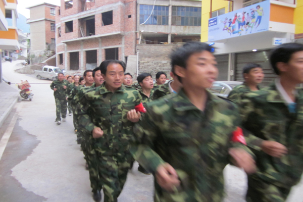 清晨六时,随着响亮的哨声,小河镇机关应急民兵连30名队员在五分钟内于镇机关院内集合完毕,小河镇防汛办公室模拟接到县防汛办的指令:发生特大山洪,一处防滑点发生垮塌,有人员和财产需要转移。30名应急民兵和应急车辆在接到命令10分钟后到出事地点,开展紧急救援。