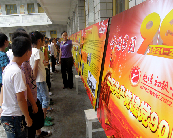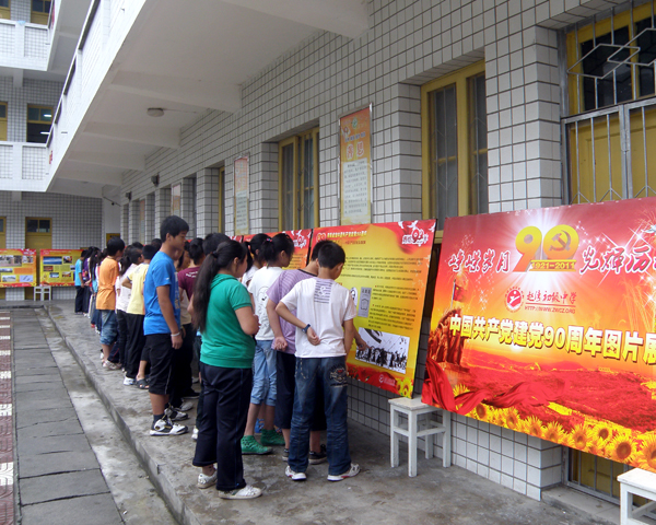 为庆祝中国共产党成立90周年,深入开展“学党史、颂党恩、跟党走”系列活动,让全体师生更好地了解中国共产党走过的光辉历程,6月23日,赵湾镇初级中学举行了庆祝建党90周年图片展活动。