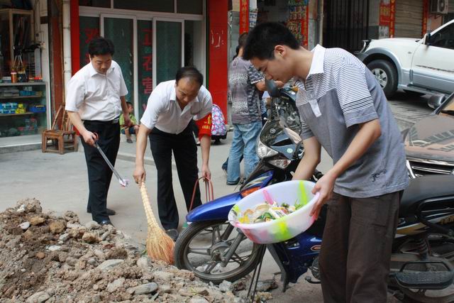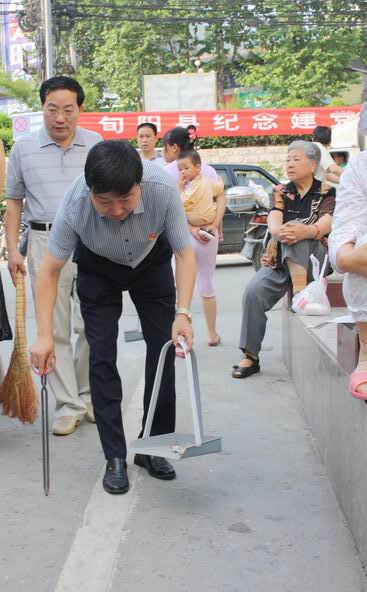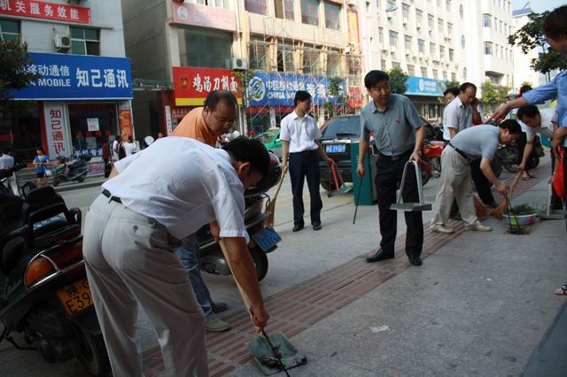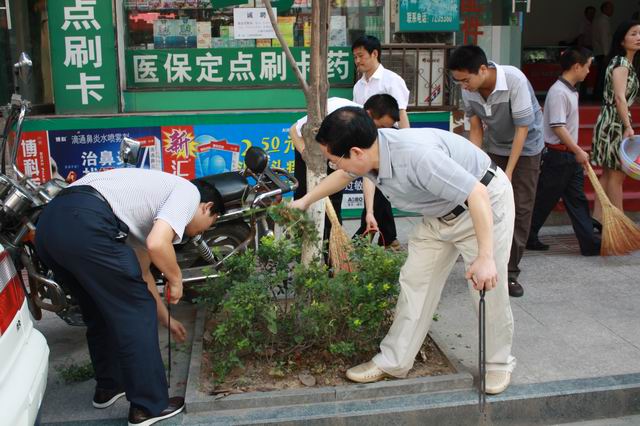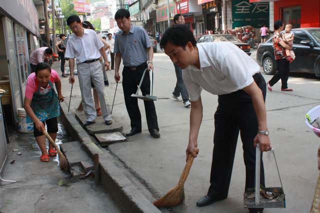 6月29日,为认真搞好“净化城区环境,喜迎建党90周年”卫生整治活动,县长张益民以身作则带领政府办全体干部职工走上街头开展卫生净化活动。