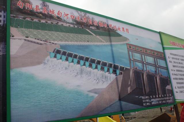 县城旬河口水力自控翻板闸坝工程位于县城旬河出口段,设计最大坝顶宽度为108.45米,闸坝最大高度为13.8米,正常蓄水位223米,主要由翻板闸、冲沙闸、右岸堤防连接段组成,计划投资3750万元,建设工期为11个月。工程建成后,库区回水长度可达到5.69公里,回水末端至党家坝大桥上游947米,在康华园大桥上游约100米处以下河段水面可满铺主河床,形成景观绕城水带,凸现“一曲旬水绕太极”优美自然景观,对改善县城生态人居环境、提高城市品位、完善城市功能、旅游产业发展具有十分重要的意义。