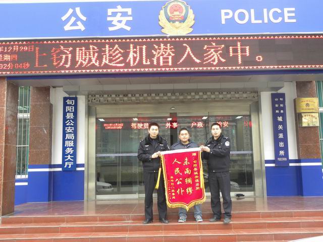 2011年12月29日凌晨2时许,城关派出所夜间巡逻民警在对城内过往车辆盘查时,一男子驾驶摩托车冲卡逃跑,民警随后驾车追赶,后男子弃车逃跑。经现场检查,发现该车是一辆被盗车辆,民警随后将该车拉回派出所暂为保管。9时许当丢失车主慌忙来报警时,得知民警已将其车找回,为表感激之情车主特制作了这面写有“未雨绸缪 人民公仆”的锦旗送给民警。目前该车已发还失主,犯罪嫌疑人正在追捕之中。