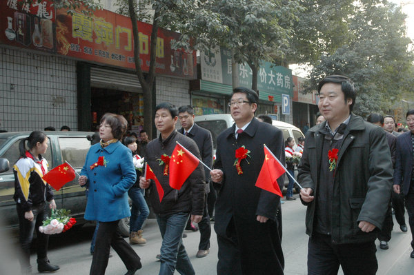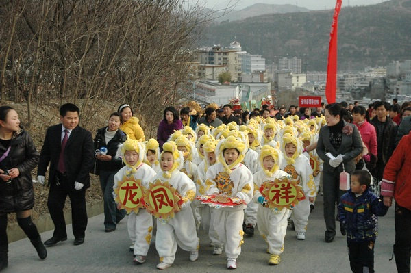 60名手持“龙凤呈祥”等图案的“龙宝宝”摇头晃脑地走在队伍最前面,邹俊杰、张益民、王惠以及省市体育局领导手持小红旗也行进在踏春队伍中,各人民团体,中省驻旬各单位,城关镇全体职工以及县内部分企业组成的方阵紧随其后,大家手持气球、花束或小旗等,边走边看,边走边说,笑容挂在每个人的脸上。老城社区社火队也行进在队伍中,欢快的锣鼓表达着人们喜悦的心情和对幸福生活的美好期盼。