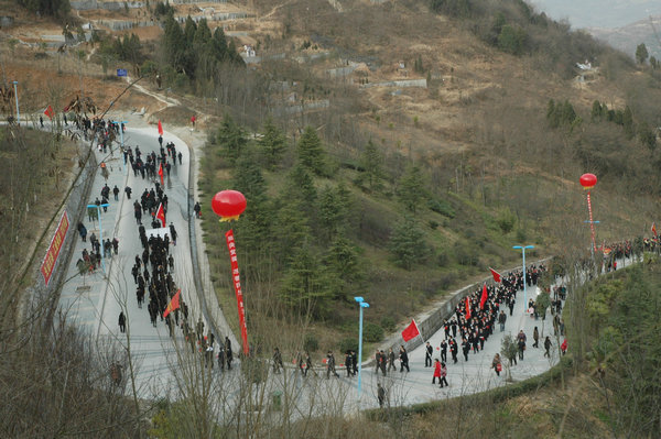 踏春队伍从祝尔慷广场出发,经瑞莲路、观景路至太极城观景台,沿途在各个醒目地段设置了“龙腾盛世门”、“百病祛除门”、“幸福康乐门”、“福禄寿喜门”、“和谐美满门”、“吉祥如意门”、“百业昌顺门”、“盛世太平门”、“再铸辉煌门”等九道寓意吉祥昌盛的彩门和拱门。在宋家岭观景台上,各个方队迈着整齐的步伐,呼喊着口号依次走过检阅台,斗志昂扬、意气风发地接受了县上领导的检阅。