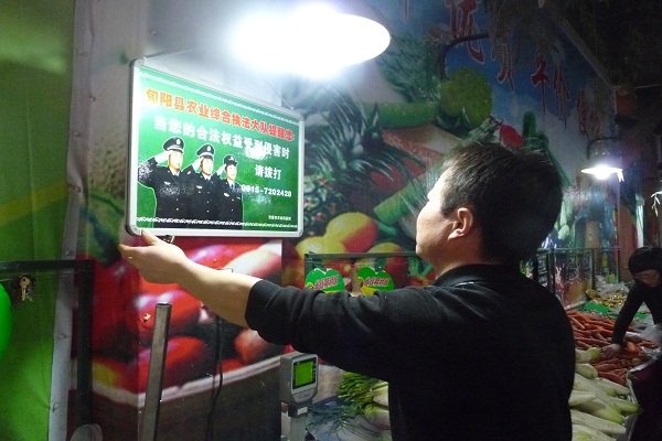 为了加强农资质量安全和农产品质量安全监管,近日,旬阳县农业综合执法大队在辖区内农资、农产品经营场所醒目位置统一悬挂了500余块设有农业执法形象的电话投诉标识牌。涉及经营单位包括农产品经营118家、兽药经营161家、农药经营107家、种子经营183家。投诉电话实行24小时值班制度,方便群众遇到质量问题能够及时向农业部门咨询投诉,加强了对农资、农产品的社会监督,确保了市场监管到位。