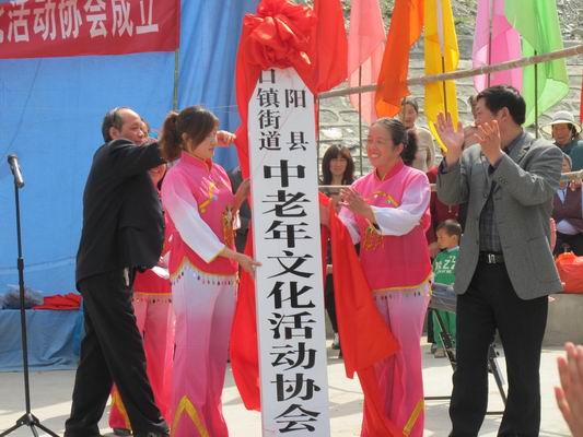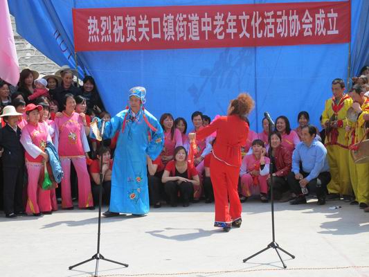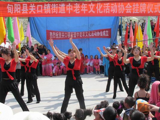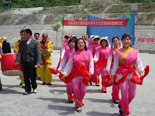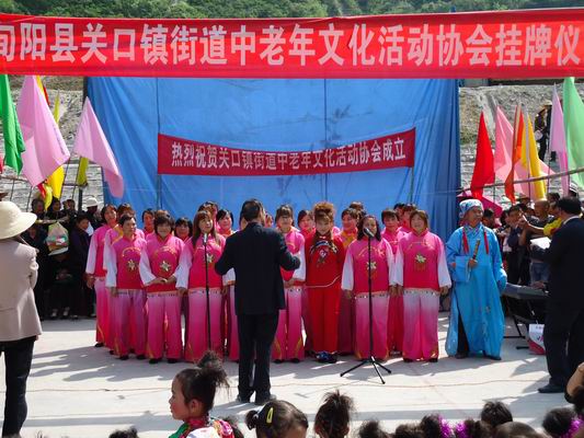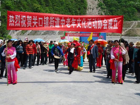 4月20日,关口镇广场锣鼓喧天、人山人海、彩旗飘扬,由该镇街道居民自发组织的中老年文化活动协会在这里挂牌成立,并现场为观众呈献了一场精彩的文化演出。